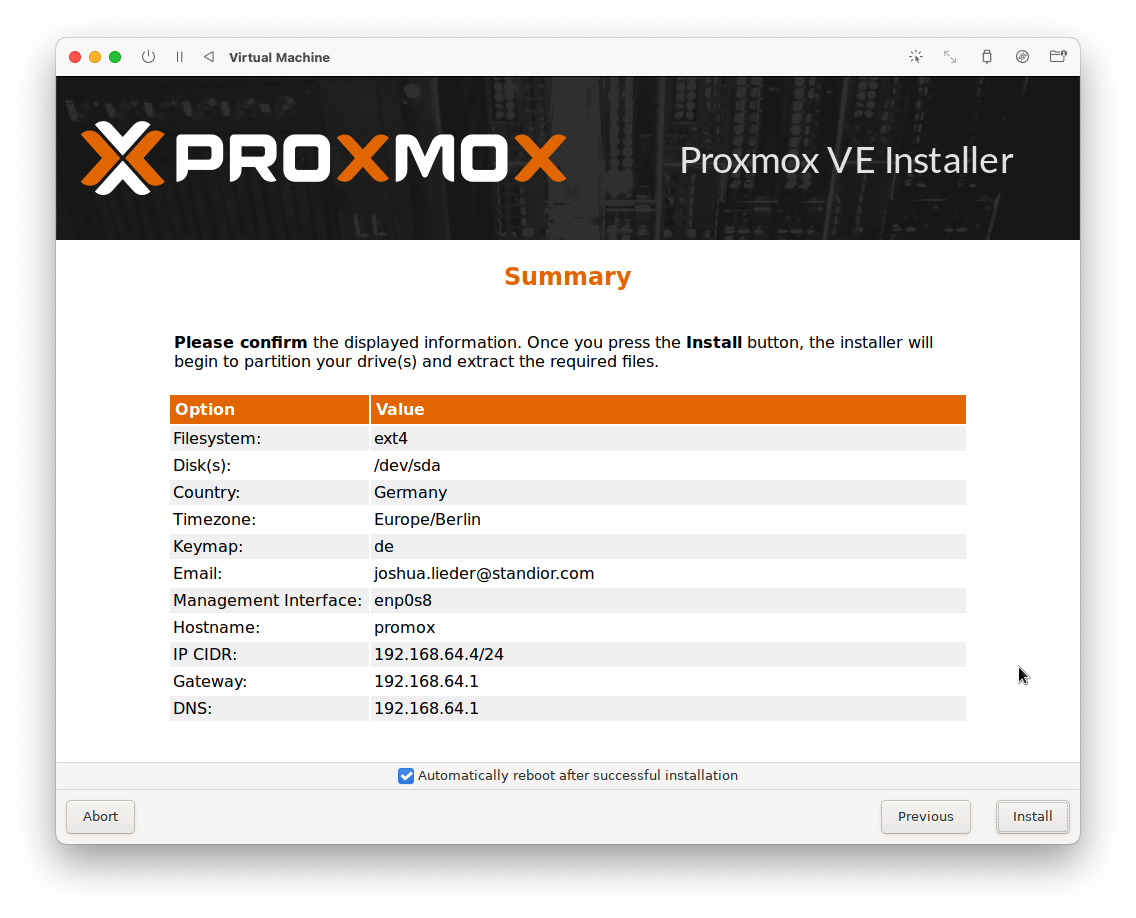 Im Anschluss bekommen wir noch mal eine Zusammenfassung der gewählten Einstellungen, mit Install bestätigen wir diese und starten die Installation.